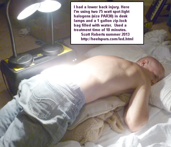 ![]() ![]() Halogen LightsHalogen lights are the strongest and least expensive light therapy, having approximately 35% of their light in the 600 to 900 nm range, being the man-made light source that is closest to the Sun because the filament temperature can get closest to the Sun. "Halogen" refers the inert gas (like iodine or bromine) that surrounds a tungsten filament that keeps it from burning out at higher temperatures so it can have a whiter color. Tungsten filaments are also used in common incandescent lights and heat lamps at lower temperatures. Incandescent and heat lamps will work almost as well if water is used to block the heat. I often use a 75 W halogen spotlight size PAR30 ($7) or a 100 Watt halogen flood light size PAR38 ($7) from Lowes or Walmart and a zip-lock bag filled with water to block the far-infrared heat. Follow my suggestions at your own risk. A snow globe filled with water can act like a lens to focus it to make it more intense, but that is not needed with the spot light. These lights are the standard outdoor lights you use on the corner of houses, although some are incandescent instead of halogen. You lay the zip lock bag of water on the injured knee, shoulder, ankle, elbow, wrist, finger, etc. Then hold the light as close to the zip lock bag without touching it. Shine the light through the water at the injured joint or other tissue. For the knee, kind of to the side or bottom so it gets on the side of the knee cap instead of directly on it. Shine it for 10 minutes once a day for most injuries. Fingers and other injuries that are not too deep need only about 5 minutes if the light is so strong you need sunglass to look at the skin surface reflection. This is going to be better than $100 to $1000 worth of LED or laser light therapy. I thought I was the first to figure this out, but it seems a small group of German researchers have known about it at least since 1995 (Hydrosun). My 75 W light is powered by a lamp cord that has a switch in the base, but you can also use a small lamp with the shade removed. There are several dangers to this, so I do not recommend anyone try it without strong caution. For example, the snow globe can focus the light too strongly and quickly burn the skin. The super-bright white light from the reflection off the skin can damage the eyes, so I have to wear sun glasses. The base gets hot, and setting the light down can burn tables and carpet. Dark skin burns very easily with this because it blocks all the visible light energy in the surface of the skin, concentrating the energy in a small volume of tissue.![]() But here's what I use. Pretty much the same thing for $10 instead of $1000's(?). Add red food coloring to the water if you want to keep the spectrum better restricted to 600 to 900 nm. The most common red food coloring dye has a perfect absorption spectrum for this. ![]() ![]() It's difficult doing pubmed searches to find others using halogen lights for healing, but you can find some articles by searching for Super Lizer or SuperLizer, Bioptron, and HydroSun. Light Therapy Bed After reading my comments about using halogen lights as a "healing" bed and for the winter blues, someone in Canada in winter 2007-2008 did a great job of implementing the ideas. I had a picture here of my "light bed" and he copied it, doing a better job (see picture below). It uses $5 full-length mirrors, $5 halogen 500 W flood lights, pyrex glass baking pans, and food coloring. The water in the pyrex pans is to block the far-infrared heat. The water can get nearly boiling hot. Use pyrex, and even with pyrex, do not blame me if boiling water spills all over your body. Use sunglasses because the blue of strong halogen lights at close range damages eyes. You do not have to use water, but you'll have to get further from the light because of the heat and take your sun bath a longer time.A lot of light energy comes through which warms you up. The food coloring in the water in the pyrex pans blocks visible light energy but still lets the red and infrared through. He actually found the spectrum from the manufacturer of the standard red food coloring which showed the proper wavelengths are allowed through. The food coloring is not needed (I wasn't able to tell much difference in the heat, and the Blue/green/yellow wavelengths are very good for the skin). The six 500 W flood lights use a total of 3,000 Watts and would need to be on two different electrical circuits in most U.S. houses without tripping a breaker. It's very calming and can put you to sleep quickly as if you're on the beach....it definitely feels as if you're on the beach. The only bad thing is that there is no U.V. for generating vitamin D which could prevent 50% of breast, colon, and prostate cancers in the U.S. - skin cancer is unimportant by comparison. 2010 update: He emailed: "About 20 minutes on my back then 20 face down.... Kind of makes me really relaxed and sleepy too . . . similar to eating turkey." 2011 update: He reports: "It heals scars and keloids - not immediately, but gradually. Also moles disappear over time, even ones I've had from birth." Email pictures to me at scott@heelspurs.com if you build a similar set up, and email me after a month and once a year to let me know how it's going so I can post results here. ![]() Here's a simpler set up that works great in the winter. ![]() What would it take to do this with LEDs? To cover from the knees to the face, top and sides, about 10,000 LEDs running at 50 mW each with normal spacing of 1.65 LEDs/cm^2 (10.6 LEDs/in^2). Power supply would therefore be 500 W. With fans, you can run the LEDs at almost 100 mW each and use half as many (spaced further apart). The 5,000 LED array shown above (with my black New Balance shoe) cost $750 for the LEDs. Someone on alibaba.com is probably already selling this type of healing bed. They should target the 15,000 tanning salons and 50,000 chiropractors in the country. Email me if you find a good one. Hal