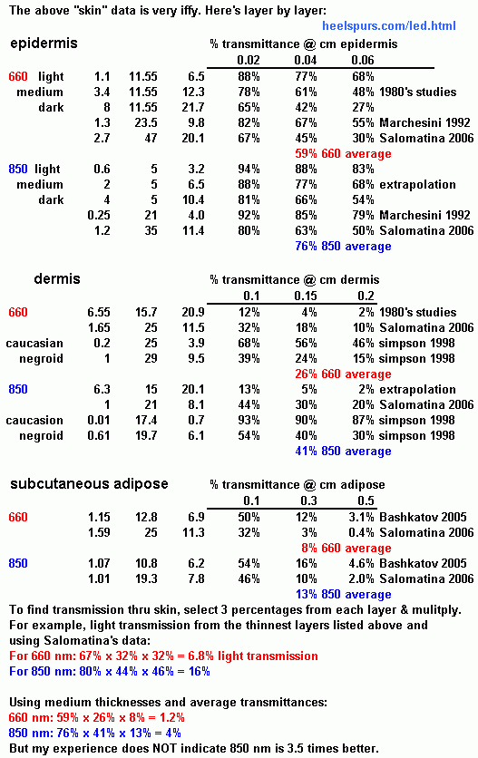 Treating the RetinaRead this section at your own risk. I am not a doctor. The safety issues are complex as can be seen in the safety section below and I often make mistakes.LED light helps only cells that are injured, not dead cells nor scar tissue. Red and infrared LED arrays may help macular degeneration, retinal tear, and laser burns, but very probably not floaters. They could possibly make floaters worse. They are best at treating injuries that have occured within the past few days (the sooner the application, the better). This means about 300 seconds of a typical 25 mW/cm^2 array which is the max officially allowed for infrared before it supposedly heats the lens and cornea. I could not find any information that indicated any normal 5 mm type LED in red could ever hurt the lens or cornea, so you can apply red for longer time periods, but because the pupil response is to become smaller, red is blocked about 5 to 10 times more than infrared, which means it would need to be applied 5 to 10 times longer. My experiments indicated (see pictures below) 5 times more because the area of a 5 mm pupil is 5 times more than a 2.3 mm pupil. I have applied 150 mW/cm^2 850 and 830 nm for 3 minutes several times and did not notice any harm, which is 3 times more than is needed to treat the retina. I believe the ideal array for treating the eye will be 25 mW/cm^2 at 830 nm for 300 seconds while being moved around (definitely not kept still where the retina might be heated too much). 850 nm may work just as well. See the Safety section below on "Retinal Heating" for more information on trying to treat the retina. Especially example 4. ![]() ![]() ![]() Safety ConcernsHalogen lights contain a lot of blue light and are very dangerous to the eyes.Typically, there are no safety concerns for LEDs unless they are blue or they are really strong or applied directly to the eye. Heating the Skin Leaving LED devices on too long and wrap tightly against the skin is probably the most likely cause of harm. Skin temperature should never be more than 41 C (105.8F) to meet FDA regs. Even a weak LED array will cause 2nd degree burns if it is wrapped snuggly with an ace bandage under blankets because the heat is not being allowed to escape. No matter how "cool" a heat-producing device operates, if it's wrapped good enough and long enough, it can get hot. I've found around 0.7 Watts per square inch to be the maximum energy that can be put into a device that touches the skin without a fan or special heat sinking, and even then it will cause 2nd degree burns if there is not an automatic off at 15 minutes and it is wrapped tightly and left in place for over an hour. Eye Safety Strong blue and white LED's harm the eyes! Strong green LEDs have 1/15th the risk of blue. Strong and focused Red and yellow LEDs appear safe for at least 5 minutes, as long as they are not the really strong kind like 1 watt and applied directly to the eye. The ACGIH does not have a safety factor specifically for simple LEDs (as of the last booklet I have which is 1996) because they appear very safe. But it has guidelines to prevent damage to the lens and retina from any light source. The TLV for laser light doesn't apply to non-laser LEDs because lasers are different because they focus the light energy in one spot which is much more likely to cause harm. Blue LEDs may harm the eyes from a photochemical injury called the "blue light hazard" (aka "solar retinitis") that can cause temporary or permanent loss of vision wherever the blue light strikes the retina. This is very dangerous and blue LEDs as key rings should be against the law. Blue is 1,000 times more dangerous than near-infrared of 890 nm (see pdf below, page 5). Red, yellow, and green also have photochemical risks, but only green has the remote possibility of causing harm (if it's high power with a narrow emission angle). Beach and snow always need dark sunglasses for protection against UV and blue damage, and over the long term it helps prevent cataracts from the infrared wavelengths. UV is the most dangerous because it has stronger photons than blue and violet. Red, yellow, and green are very safe as long as the power is not so high that the retina heats up (this may cause floaters or other less serious "silent" injuries, but I do not have a erference). For yellow, green, and most reds, it will be clear the light is too bright before any harm occurs, unless it is laser light. Do not assume any of these statements are true when dealing with LEDs. Use this information your own risk. Lens and Cornea Potentially Harmed by InfraredCataracts are the more likely source of harm from non-laser, non-blue light, and it occurs from near-infrared and far-infrared (> 770, but < 3,000 nm), but not red. If you work outside or in front of an oven all day for years without eye protection, you are slightly more likely to develop cataracts (in the lens). See long quote below. Glass and thick plastic (safety glasses might be too thin) block far infrared (steel workers) and sunglass for the beach and snow that are not too weak and orange-tinted will probably be OK for the red and near-infrared heat energy. The ACGIH TLV guidelines say infrared eye exposure to prevent injury to lens and cornea should be less than 10 mW/cm^2 if it's greater than 15 minutes. For less than 15 minutes, the TLV guidelines says mW/cm^2 should be < 1800 mW* (seconds)^(-0.75). This equation means that for a typical 25 mW/cm^2 infrared LED device, it's safe to apply up to 300 seconds. These equations overstate the risks of 770 nm to 850 nm from LEDs because the lens and cornea in this range absorb roughly 5 times less energy than longer wavelengths (see links above). Similarly, water and plastic do not hardly block 770 to 850 nm compared to > 850 nm (see charts above). This means 770 to 850 nm make it to the retina seemingly as well as red, which means, like red, they have less energy that can harm the cornea and lens. Red carries even l